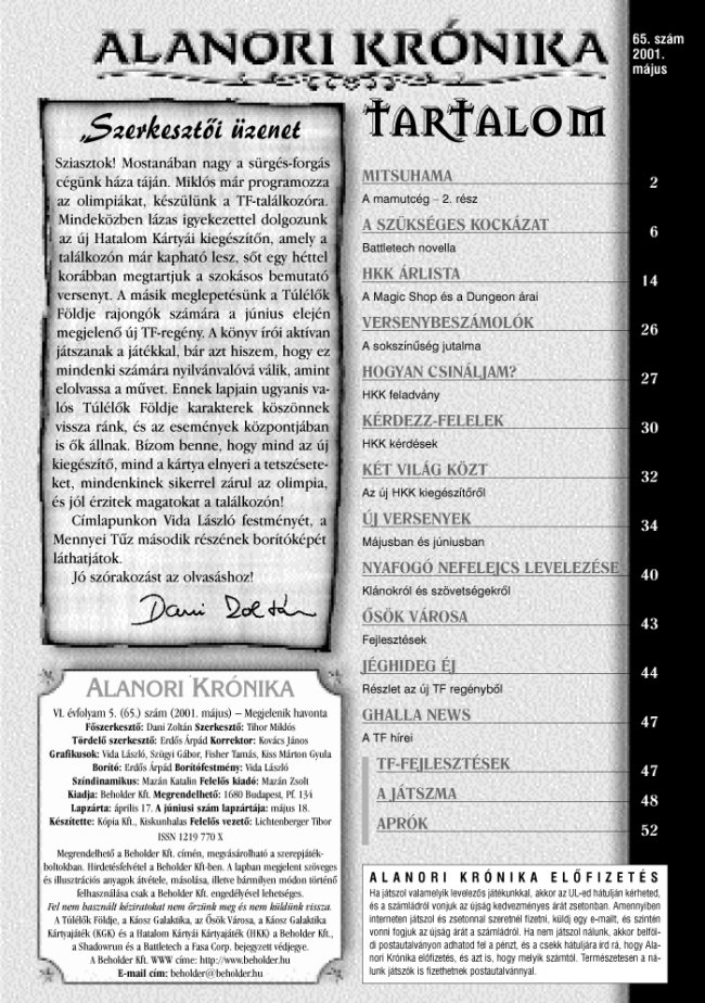Alanori Krónika 65. (2001. május) - Tartalomjegyzék