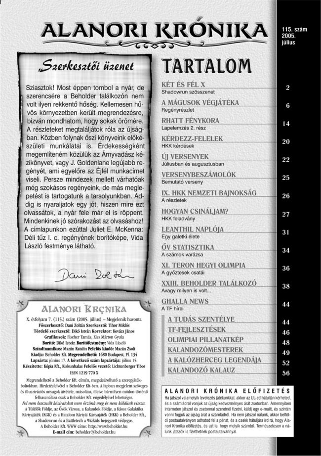 Alanori Krónika 115. (2005. július) - Tartalomjegyzék