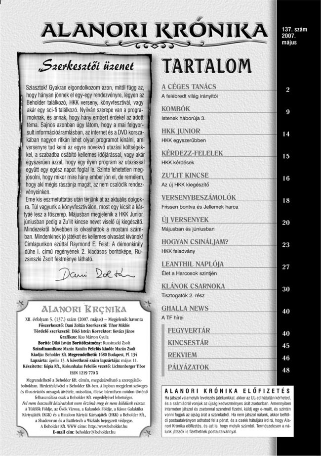 Alanori Krónika 137. (2007. május) - Tartalomjegyzék