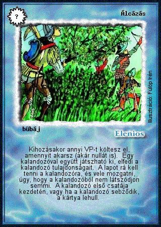 Kiadás: Alappakli, 1. kiadás Gyakoriság: nem gyakori Lapszín (isten): Elenios Típus: bűbáj Szöveg: Kihozásakor annyi VP-t költesz el, amennyit akarsz (akár nullát is). Egy kalandozóval együtt játszható ki, elfedi a kalandozó tulajdonságait. A lapot rá kell tenni a kalandozóra, és vele mozgatni, úgy, hogy a kalandozóból nem látszódjon semmi. A kalandozó első csatája kezdetén, vagy ha a kalandozó sebződik, a kártya lehull. Illusztráció: Fülöp Irén