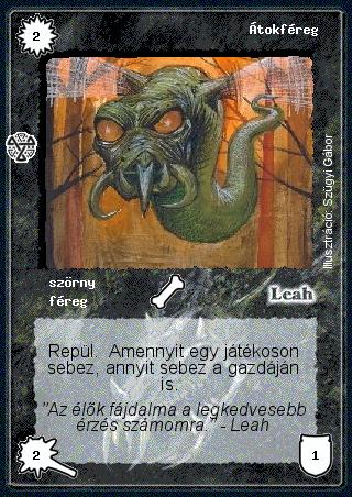 Kiadás: Isteni szövetség Gyakoriság: gyakori Lapszín (isten): Leah Típus: szörny Altípus: féreg Szöveg: Repül. Amennyit egy játékoson sebez, annyit sebez a gazdáján is. Szinesítő szöveg: "Az élők fájdalma a legkedvesebb érzés számomra." - Leah Illusztráció: