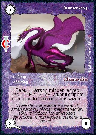 Kiadás: Sötét kor Gyakoriság: nem gyakori Lapszín (isten): Chara-din Típus: szörny Altípus: sárkány Szöveg: Repül. Hátrány: minden lényed kap -2 ÉP-t. 2 VP: átkerül célpont ellenfeled tartalékjába, passzívan. Szinesítő szöveg: "A Mester megidézte a sárkányt, aztán napokig próbált megszabadulni tőle, miközben folyamatosan átkozódott. Innen kapta a sárkány a nevét." Illusztráció: Váradi János