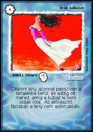 Kiadás: Alappakli, 1. kiadás, Alappakli, 2. kiadás, Alappakli, 3. kiadás, Alappakli, 4. kiadás Gyakoriság: gyakori Lapszín (isten): Elenios Típus: bűbáj lényre Szöveg: Célpont lény azonnal passzívan a tartalékba kerül, és addig ott marad, amíg a bűbájt le nem oldják róla. Az előkészítő fázisban a lény nem aktivizálódik. Illusztráció: Nagy Zoltán