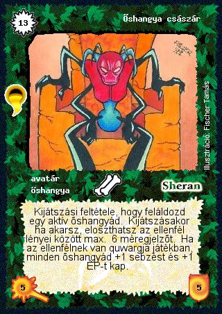 Kiadás: Aranyforrás, Védnök 2023, Túlélők Földje Gyakoriság: ritka Lapszín (isten): Sheran Típus: avatár Altípus: őshangya Szöveg: Kijátszási feltétele, hogy feláldozd egy aktív őshangyád. Kijátszásakor ha akarsz, eloszthatsz az ellenfél lényei között max. 6 méregjelzőt. Ha az ellenfélnek van quwargja játékban, minden őshangyád +1 sebzést és +1 ÉP-t kap. Illusztráció: Fischer Tamás