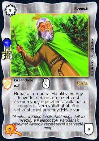 Kiadás: Kalandozók városa (Invázió) Gyakoriság: ritka Lapszín (isten): Raia Típus: kalandozó Altípus: elf Szöveg: Bűbájra immúnis. Ha aktív, és egy lényedet sebzés éri, a sebzést részben vagy egészben átvállalhatja magára. Nem vállalhat át több sebzést, mint amennyi ÉP-je van. Szinesítő szöveg: "Amikor a külső létsíkokról megindult az Invázió, a Kalandozók Városának védelmét Avengir vezetésével szervezték meg." Illusztráció: