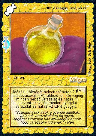 Kiadás: Sötét kor Gyakoriság: nem gyakori Lapszín (isten): Mágus Klán Típus: tárgy Szöveg: Idézési költségét helyettesítheted 2 ÉP feláldozásával. (P), áldozd fel: kör végéig minden sebző varázslat és hatás +1 sebzést okoz, és minden gyógyító varázslat és hatás +2 ÉP-t gyógyít. Szinesítő szöveg: "Szánalmasak azok a gyenge galetkik, akiknek varázsitalokra és egyéb segédeszközökre van szükségük ahhoz, hogy varázsolni tudjanak." - Ren Illusztráció: Balla Péter