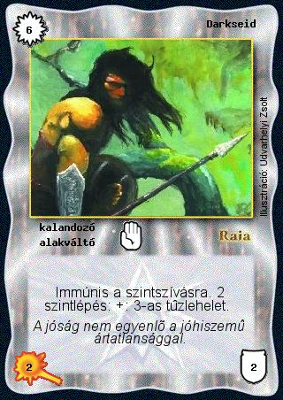 Kiadás: Alappakli, 1. kiadás, Alappakli, 2. kiadás, Alappakli, 3. kiadás, Alappakli, 4. kiadás Gyakoriság: nem gyakori Lapszín (isten): Raia Típus: kalandozó Altípus: alakváltó Szöveg: Immúnis a szintszívásra. 2 szintlépés: +: 3-as tűzlehelet. Szinesítő szöveg: A jóság nem egyenlő a jóhiszemű ártatlansággal. Illusztráció: Udvarhelyi Zsolt