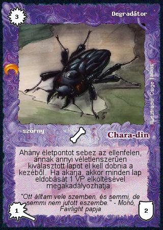 Kiadás: Chara-din visszatér Gyakoriság: gyakori Lapszín (isten): Chara-din Típus: szörny Szöveg: Ahány életpontot sebez az ellenfelen, annak annyi véletlenszerűen kiválasztott lapot el kell dobnia a kezéből. Ha akarja, akkor minden lap eldobását 1 VP elköltésével megakadályozhatja. Szinesítő szöveg: "Ott álltam vele szemben, és semmi, de semmi nem jutott eszembe." - Mohó, Fairlight papja Illusztráció: Csige Tamás