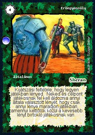 Kiadás: Árnyékhold Gyakoriság: ritka Lapszín (isten): Sheran Típus: általános Szöveg: Kijátszási feltétele, hogy legyen játékban lényed. Neked és célpont játékosnak fel kell áldoznia annyi általa választott lényét, hogy csak annyi lénye maradjon játékban, amennyi kettőtök közül a kevesebb lényt birtokló játékosnak van. Illusztráció: