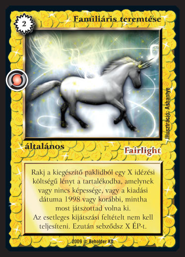 Kiadás: Elözönlés Gyakoriság: nem gyakori Lapszín (isten): Fairlight Típus: általános Altípus: - Szöveg: Rakj a kiegészítő paklidból egy X idézési költségű lényt a tartalékodba, amelynek vagy nincs képessége, vagy a kiadási dátuma 1998 vagy korábbi, mintha most játszottad volna ki. Az esetleges kijátszási feltételt nem kell teljesíteni. Ezután sebződsz X ÉP-t. Szinesítő szöveg: "Minden valamirevaló mágusnak van legalább egy familiárisa." Illusztráció: Ashantye