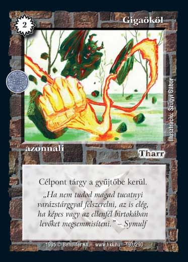 Kiadás: Alappakli, 1. kiadás, Alappakli, 2. kiadás, Alappakli, 3. kiadás, Alappakli, 4. kiadás, Túlélők Földje Gyakoriság: gyakori Lapszín (isten): Tharr Típus: azonnali Szöveg: Célpont tárgy a gyűjtőbe kerül. Szinesítő szöveg: Ha mem tudod magad tucatnyi varázstárggyal felszerelni, az is elég, ha képes vagy az ellenfél birtokában lévőket megsemmisíteni. - Symulf Illusztráció:
