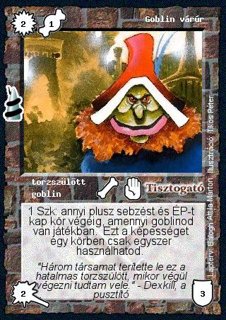 Kiadás: Rúvel hegy Gyakoriság: nem gyakori Lapszín (isten): Tisztogató Klán Típus: torzszülött Altípus: goblin Szöveg: 1 Szk: annyi plusz sebzést és ÉP-t kap kör végéig, amennyi goblinod van játékban. Ezt a képességet egy körben csak egyszer használhatod. Szinesítő szöveg: "Három társamat terítette le ez a hatalmas torzszülött, mikor végül végezni tudtam vele." - Dexkill, a pusztító Illusztráció: Tikos Péter Tervező: Balogh Attila Márton