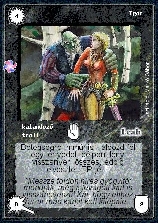 Kiadás: Létsíkok Gyakoriság: nem gyakori Lapszín (isten): Leah Típus: kalandozó Altípus: troll Szöveg: Betegségre immúnis. áldozd fel egy lényedet: célpont lény visszanyeri összes, eddig elvesztett ÉP-jét. Szinesítő szöveg: "Messze földön híres gyógyító: mondják, még a levágott kart is visszanöveszti! Kár, hogy ehhez először más karját kell kitépnie..." Illusztráció: Markó Gábor