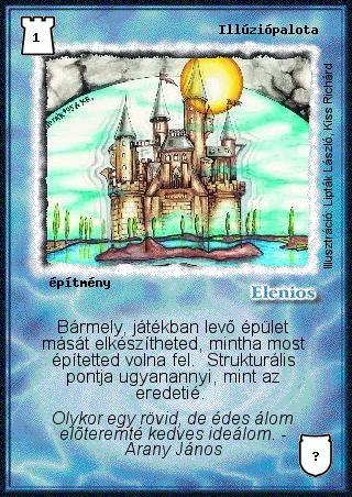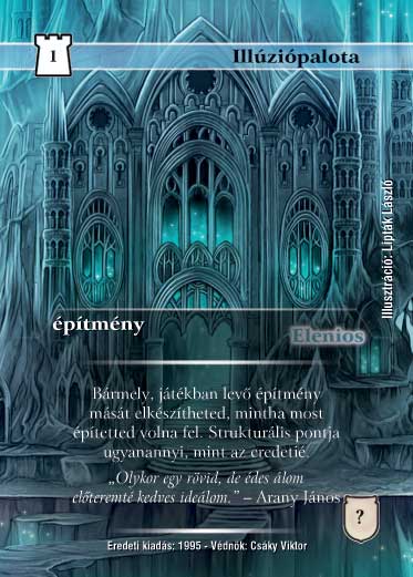 Kiadás: Alappakli, 1. kiadás, Alappakli, 2. kiadás, Alappakli, 3. kiadás, Alappakli, 4. kiadás, Védnök 2023 Gyakoriság: ritka Lapszín (isten): Elenios Típus: építmény Szöveg: Bármely, játékban levő építmény mását elkészítheted, mintha most építetted volna fel. Strukturális pontja ugyanannyi, mint az eredetié. Szinesítő szöveg: Olykor egy rövid, de édes álom előteremté kedves ideálom. - Arany János Illusztráció: Lipták László, Kiss Richárd