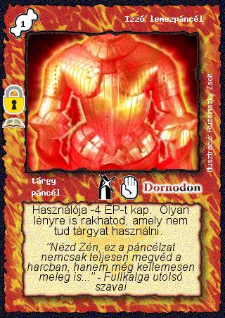 Kiadás: Nuk kincseskamrája (Zén) Gyakoriság: ritka Lapszín (isten): Dornodon Típus: tárgy Altípus: páncél Szöveg: Használója -4 ÉP-t kap. Olyan lényre is rakhatod, amely nem tud tárgyat használni. Szinesítő szöveg: "Nézd Zén, ez a páncélzat nemcsak teljesen megvéd a harcban, hanem még kellemesen meleg is..." - Fullkalga utolsó szavai Illusztráció: Ruzsinszki Zsolt