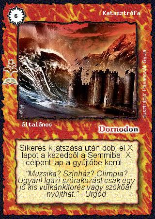 Kiadás: Holtláp (Zén) Gyakoriság: ritka Lapszín (isten): Dornodon Típus: általános Szöveg: Sikeres kijátszása után dobj el X lapot a kezedből a Semmibe: X célpont lap a gyűjtőbe kerül. Szinesítő szöveg: "Muzsika? Színház? Olimpia? Ugyan! Igazi szórakozást csak egy jó kis vulkánkitörés vagy szökőár nyújthat." - Urgod Illusztráció: Havancsák Gyula