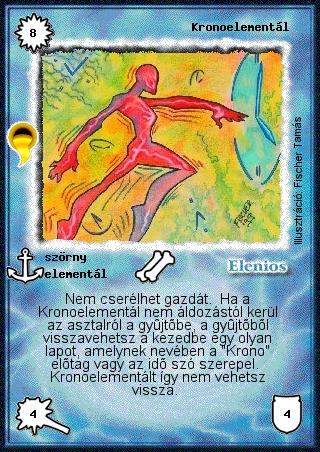 Kiadás: Aranyforrás Gyakoriság: ritka Lapszín (isten): Elenios Típus: szörny Altípus: elementál Szöveg: Nem cserélhet gazdát. Ha a Kronoelementál nem áldozástól kerül az asztalról a gyűjtőbe, a gyűjtőből visszavehetsz a kezedbe egy olyan lapot, amelynek nevében a "Krono" előtag vagy az idő szó szerepel. Kronoelementált így nem vehetsz vissza. Illusztráció: Fischer Tamás