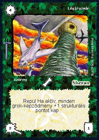 Kiadás: Hőskorszak Gyakoriság: gyakori Lapszín (isten): Sheran Típus: szörny Szöveg: Repül Ha aktív, minden grok-képződmény +1 strukturális pontot kap. Illusztráció: Kerekes Ilona