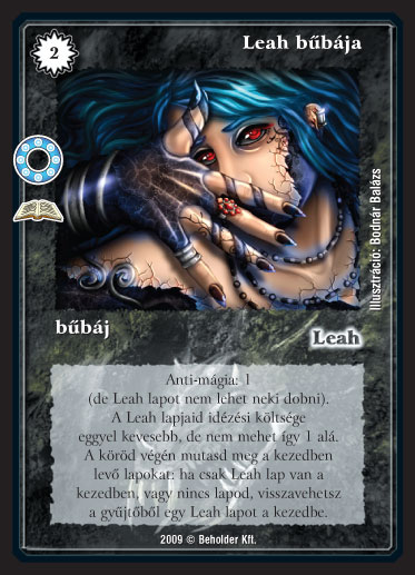 Kiadás: A hatalom körei (Zén) Gyakoriság: ritka Lapszín (isten): Leah Típus: bűbáj Altípus: - Szöveg: Anti-mágia: 1 (de Leah lapot nem lehet neki dobni). A Leah lapjaid idézési költsége eggyel kevesebb, de nem mehet így 1 alá. A köröd végén mutasd meg a kezedben levő lapokat: ha csak Leah lap van a kezedben, vagy nincs lapod, visszavehetsz a gyűjtőből egy Leah lapot a kezedbe. Illusztráció: Bodnár Balázs