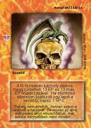 Kiadás: Káoszkatlan Gyakoriság: nem gyakori Lapszín (isten): Nincs Típus: követő Szöveg: A fő fázisában bármely játékos megszüntetheti 13 ÉP és 13 max. ÉP feláldozásával. Ha ellenfeled sikeresen kijátszott egy lapot a kezéből, kapsz 1 VP-t. Szinesítő szöveg: "Sokáig nem értettük, honnan szerzi a varázsló a hatalmát. De miután az apró, ördögszerű lényt elpusztítottuk, már sokkal könnyebben ment minden..." Illusztráció: Varga András