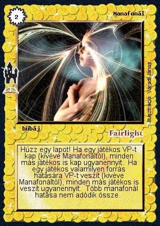 Kiadás: Timera kastélya (Zén) Gyakoriság: ritka Lapszín (isten): Fairlight Típus: bűbáj Szöveg: Húzz egy lapot! Ha egy játékos VP-t kap (kivéve Manafonáltól), minden más játékos is kap ugyanennyit. Ha egy játékos valamilyen forrás hatására VP-t veszít (kivéve Manafonáltól), minden más játékos is veszít ugyanennyit. Több manafonál hatása nem adódik össze. Illusztráció: Váradi János