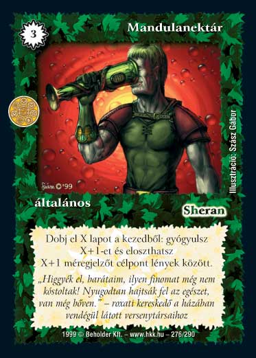 Kiadás: Földanya paradicsoma (Invázió), Túlélők Földje Gyakoriság: ritka Lapszín (isten): Sheran Típus: általános Szöveg: Sikeres kijátszása után dobj el X lapot a kezedből: gyógyulsz X+1 életpontot, és eloszthatsz X+1 méregjelzőt a játékban levő célpont lények között. Szinesítő szöveg: "Higgyék el, barátaim, ilyen finomat még nem kóstoltak! Nyugodtan hajtsák fel az egész pohárral, van még bőven." - Szu-lu roxati kereskedő szavai a házában vendégül látott versenytársaihoz Illusztráció: Szász Gábor
