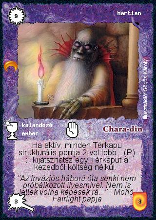 Kiadás: Chara-din visszatér Gyakoriság: ritka Lapszín (isten): Chara-din Típus: kalandozó Altípus: ember Szöveg: Ha aktív, minden Térkapu strukturális pontja 2-vel több. (P): kijátszhatsz egy Térkaput a kezedből költség nélkül. Szinesítő szöveg: "Az Inváziós háború óta senki nem próbálkozott ilyesmivel. Nem is lettek volna képesek rá..." - Mohó, Fairlight papja Illusztráció: Gőgös Károly
