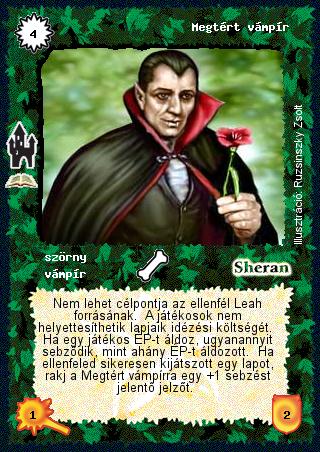 Kiadás: Timera kastélya (Zén) Gyakoriság: ritka Lapszín (isten): Sheran Típus: szörny Altípus: vámpír Szöveg: Nem lehet célpontja az ellenfél Leah forrásának. A játékosok nem helyettesíthetik lapjaik idézési költségét. Ha egy játékos ÉP-t áldoz, ugyanannyit sebződik, mint ahány ÉP-t áldozott. Ha ellenfeled sikeresen kijátszott egy lapot, rakj a Megtért vámpírra egy +1 sebzést jelentő jelzőt. Illusztráció: Ruzsinszki Zsolt