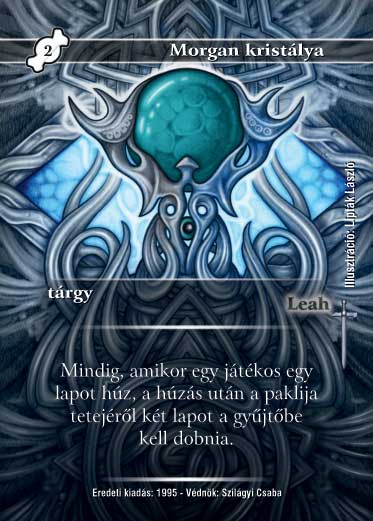 Kiadás: Alappakli, 3. kiadás, Alappakli, 4. kiadás, Hőskorszak, Védnök 2023 Gyakoriság: ritka Lapszín (isten): Leah Típus: tárgy Szöveg: Mindig, amikor egy játékos egy lapot húz, a húzás után a paklija tetejéről két lapot a gyűjtőbe kell dobnia. Szinesítő szöveg: "Morgan, az átkozott ősmágus. Végül olyan furmányos módon győzött le, amelynek lehetősége soha eszembe nem jutott volna." - Rughar Illusztráció: Lipták László