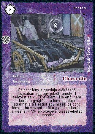 Kiadás: Isteni szövetség Gyakoriság: gyakori Lapszín (isten): Chara-din Típus: bűbáj Altípus: betegség Szöveg: Célpont lény a gazdája előkészítő fázisában kap egy jelzőt, amely -1 sebzést és -1 ÉP-t jelent. Ha ettől nem került a gyűjtőbe, a lény gazdája átrakhatja a Pestist egy másik célpont lényre, ha viszont ettől a gyűjtőbe került, a Pestist 4 VP elköltésével visszaveheted a kezedbe. Illusztráció: