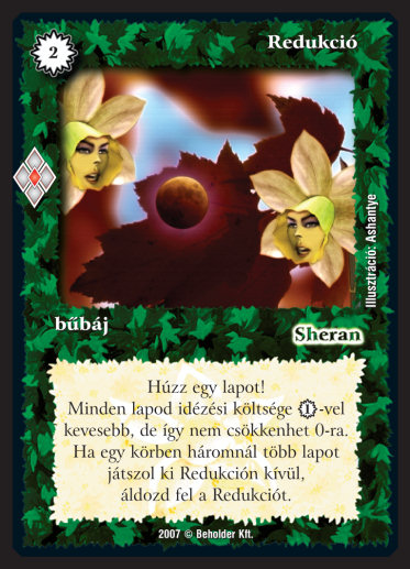 Kiadás: Misztikus Erők Gyakoriság: nem gyakori Lapszín (isten): Sheran Típus: bűbáj Altípus: - Szöveg: Húzz egy lapot! Minden lapod idézési költsége 1_VP-vel kevesebb, de igy nem csökkenhet 0-ra. Ha egy körben háromnál több lapot játszol ki Redukción kívül, áldozd fel a Redukciót. Illusztráció: Ashantye