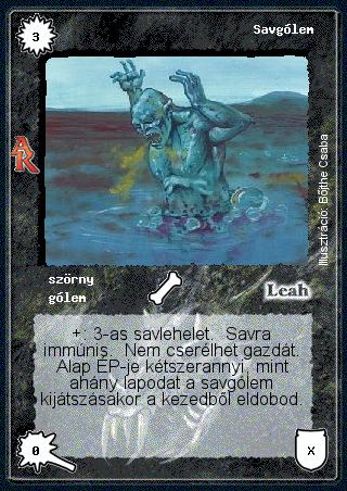 Kiadás: Alanori Krónika Gyakoriság: ritka Lapszín (isten): Leah Típus: szörny Altípus: gólem Szöveg: +: 3-as savlehelet. Savra immúnis. Nem cserélhet gazdát. Alap ÉP-je kétszerannyi, mint ahány lapodat a savgólem kijátszásakor a kezedből eldobod. Illusztráció: Bőjthe Csaba