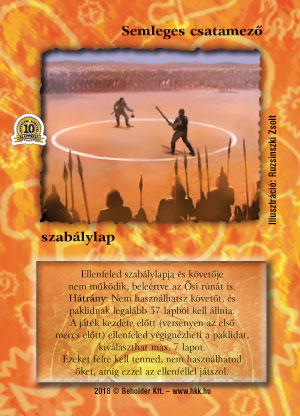 Kiadás: Legendák Völgye, Alappakli, 10. kiadás, Védnök 2023 Gyakoriság: ritka Lapszín (isten): Nincs Típus: szabálylap Szöveg: Ellenfeled szabálylapja és követője nem működik, beleértve az ősi rúnát is. Te nem használhatsz követőt, és paklidnak legalább 52 lapból kell állnia. A játék kezdete előtt (versenyen az első meccs előtt) ellenfeled végignézheti a paklidat, kiválaszthat max. 7 lapot. Ezeket félre kell tenned, nem használhatod őket, amíg ezzel az ellenféllel játszol. Illusztráció: Ruzsinszki Zsolt