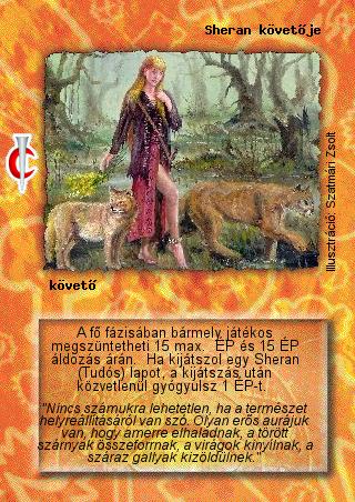 Kiadás: Sötét kor Gyakoriság: nem gyakori Lapszín (isten): Nincs Típus: követő Szöveg: A fő fázisában bármely játékos megszüntetheti 15 max. ÉP és 15 ÉP áldozás árán. Ha kijátszol egy Sheran (Tudós) lapot, a kijátszás után közvetlenül gyógyulsz 1 ÉP-t. Szinesítő szöveg: "Nincs számukra lehetetlen, ha a természet helyreállításáról van szó. Olyan erős aurájuk van, hogy amerre elhaladnak, a törött szárnyak összeforrnak, a virágok kinyílnak, a száraz gallyak kizöldülnek." Illusztráció: Szatmári Zsolt