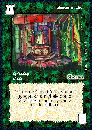 | (AK21) Akkor is gyógyulok egyet az előkészítő fázisomban, ha játékban van egy Pozitív létsíkom, egy Sheran oltárom, de nincs Sheran lény a tartalékomban. Ebben az esetben 0 Sheran lény van a tartalékodban, az oltár 0-át gyógyítana, de a helyszín miatt minden gyógyító varázslat és hatás eggyel többet gyógyít. |