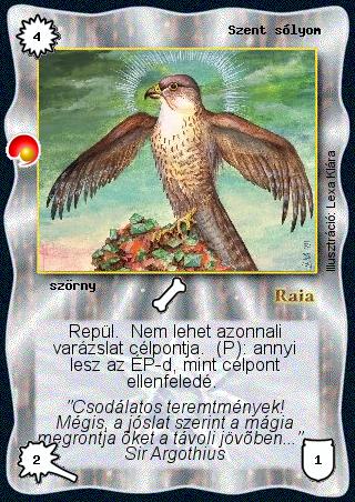 Kiadás: Két világ közt Gyakoriság: ritka Lapszín (isten): Raia Típus: szörny Szöveg: Repül. Nem lehet azonnali varázslat célpontja. (P): annyi lesz az ÉP-d, mint célpont ellenfeledé. Szinesítő szöveg: "Csodálatos teremtmények! Mégis, a jóslat szerint a mágia megrontja őket a távoli jövőben..." - Sir Argothius Illusztráció: Lexa Klára