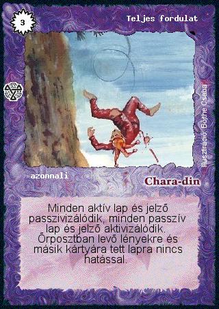 Kiadás: Isteni szövetség Gyakoriság: gyakori Lapszín (isten): Chara-din Típus: azonnali Szöveg: Minden aktív lap és jelző passzivizálódik, minden passzív lap és jelző aktivizálódik. Őrposztban levő lényekre és másik kártyára tett lapra nincs hatással. Illusztráció: Bőjthe Csaba