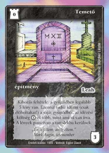 Kiadás: Alappakli, 1. kiadás, Védnök 2021 Gyakoriság: ritka Lapszín (isten): Leah Típus: építmény Szöveg: Kihozás feltétele: a gyűjtődben legalább 5 lény van. Ezentúl tudsz idézni (csak élőholtakat!) a saját gyűjtődből, az idézési költség 1 VP-el több, mint ami rá van írva. A lények passzívan a tartalékba kerülnek. Szinesítő szöveg: "Én is féltem, amíg éltem." Mork Augin, tetemember Illusztráció: Hörcher László