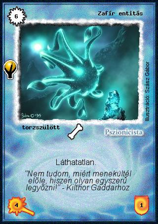 Kiadás: Alappakli, 5. kiadás (Ősök városa), Alappakli, 6. kiadás (Ősök Városa) Gyakoriság: ritka Lapszín (isten): Pszionicista Klán Típus: torzszülött Szöveg: Láthatatlan. Szinesítő szöveg: "Nem tudom, miért menekültél előle, hiszen olyan egyszerű legyőzni!" - Kilthor Gaddarhoz Illusztráció: Szász Gábor