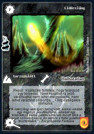 Kiadás: Rúvel hegy Gyakoriság: nem gyakori Lapszín (isten): Halhatatlan Klán Típus: torzszülött Szöveg: Repül. Kijátszási feltétele, hogy feláldozd egy lényedet. Nem kerülhet rá jelző, varázslattal nem lehet megsebezni, nem lehet varázslat célpontja, + képességekre immúnis. Szinesítő szöveg: "A lidércláng nem igazi torzszülött, sokkal inkább egy mágikus manifesztáció, amelyet egy kísérletező kedvű galetki varázsló hozott létre a saját szórakozására, és persze a fiatal galetkik tesztelésére." - Encyclopedia Fantasia Illusztráció: Szász Gábor