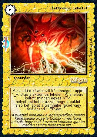 Kiadás: Sötét kor Gyakoriság: gyakori Lapszín (isten): Mágus Klán Típus: testrész Szöveg: A galetki a következő képességet kapja: " +: 3-as elektromos lehelet. A leheletre költött minden egyes VP-t helyettesítheted azzal, hogy a paklid felső két lapját a Semmibe rakod vagy feláldozod 1 ÉP-det. ". Szinesítő szöveg: "A pusztító leheletek a legalapvetőbb galetki képességek közé tartoznak - más lapra tartozik, hogy csak kevesen képesek igazán mesteri szintre fejleszteni azt." Illusztráció: Szalai László
