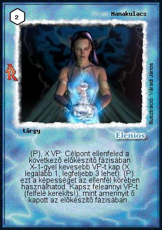 Kiadás: Alanori Krónika, Alappakli, 8. kiadás Gyakoriság: ritka Lapszín (isten): Elenios Típus: tárgy Szöveg: (P), X VP: Célpont ellenfeled a következő előkészítő fázisában X-1-gyel kevesebb VP-t kap (X legalább 1, legfeljebb 3 lehet). (P): ezt a képességet az ellenfél körében használhatod. Kapsz feleannyi VP-t (felfelé kerekíts!), mint amennyit ő kapott az előkészítő fázisában. Illusztráció: Váradi János